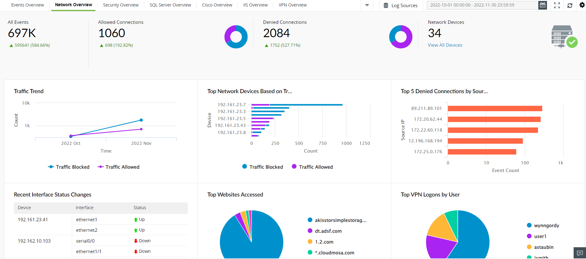 A SOC team equipped with the right tools will find that outbound traffic can reveal a lot about what an attacker is doing in the network. Anomalies in your outbound traffic that should be taken seriously include: communication from workstations using unusual protocols, large amount of data leaving your network, and signs of communication with known malicious IPs or with IPs from new geographical locations. These indicators will let your SOC team know if there is communication with an attacker's C&C servers, or if data is being transferred to suspicious recipients. Figure 4 shows how a well-organized Log360 dashboard gives you an overview of network activity.