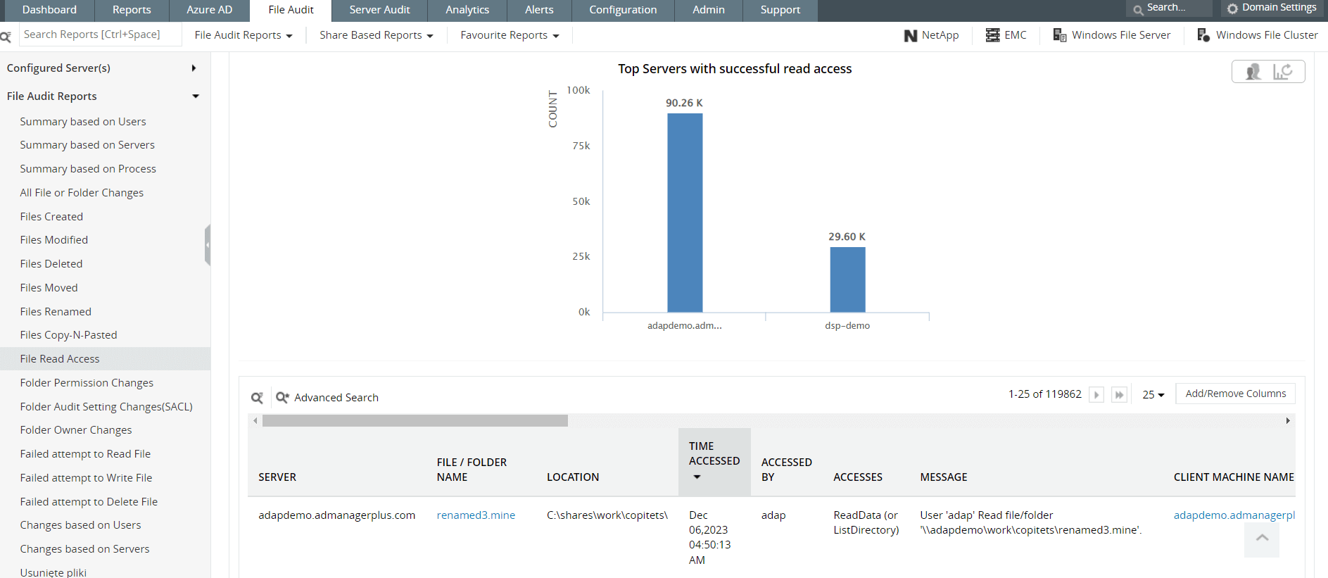 Numerous attempts to access a particular file could be an important signal, because an attacker may be using various ways to gain access to the file. Following this signal with relevant metadata can make this an important indicator of compromise that you dont want to miss out on. Figures 5 and 6 show file monitoring reports in Log360.
