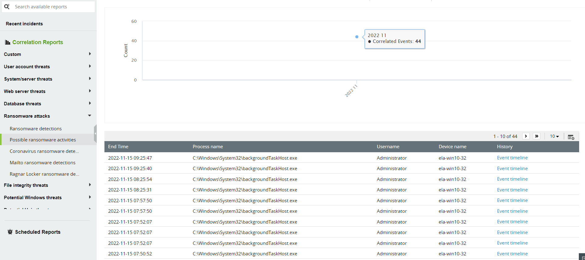 Figure 10: Built-in correlation reports in Log360 help SOC teams track possible ransomware activity.