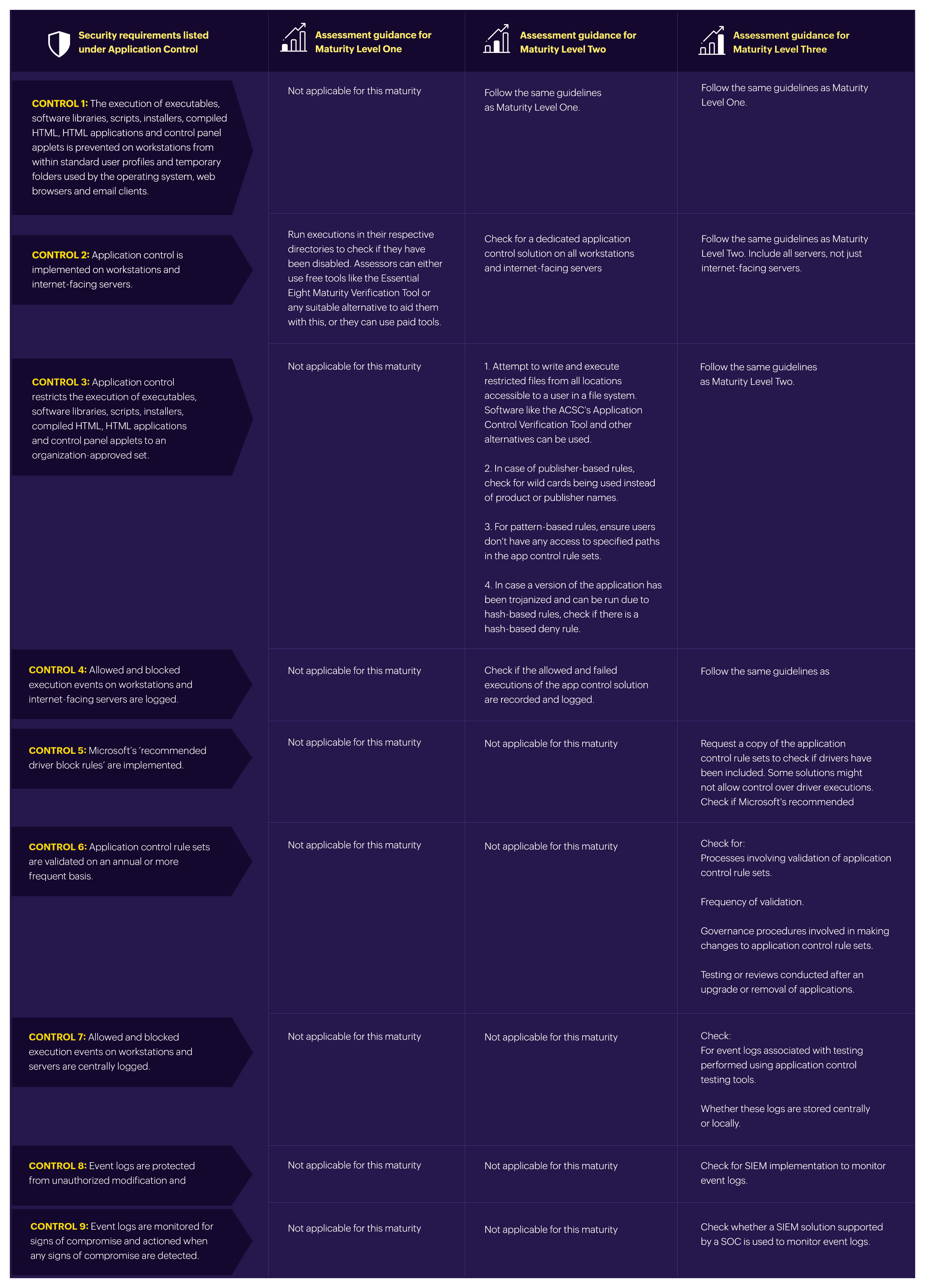 The guidance is cumulative in nature. This means that organizations aiming for Maturity Level Two must follow the guidelines for both levels one and two. To understand this better, the table below shows how the implementation of application control (which is the hardest to implement) will be assessed across organizations of different maturity levels.