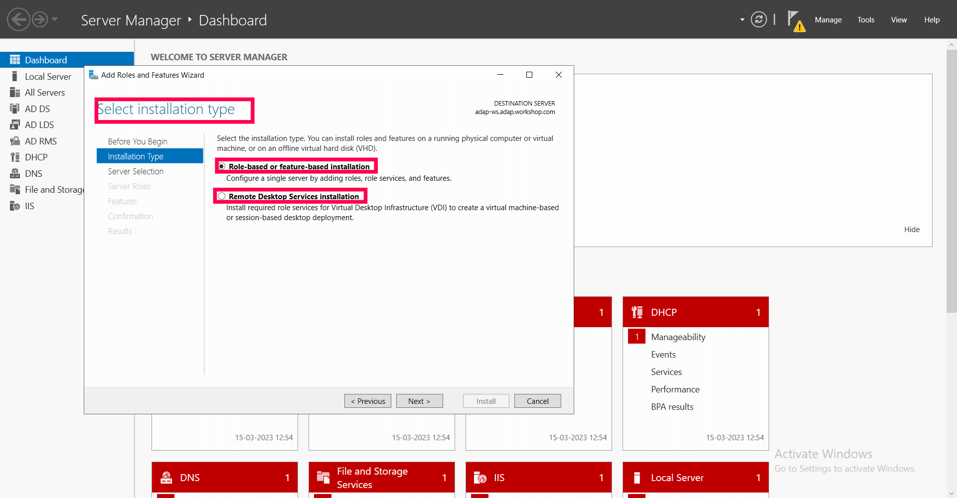 Next on the Select installation type page, choose Role-based or feature-based installation, or if it's a virtual machine-based deployment then choose Remote Desktop Services installation. Click Next.