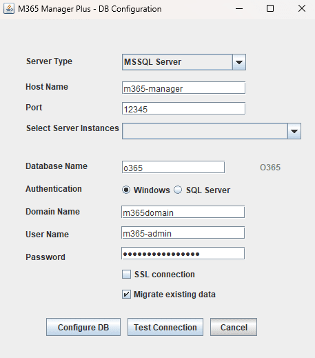 M365 Manager Plus comes bundled with a PostgreSQL database to store the product's data from its reporting, monitoring, management, and auditing modules. The solution also supports MS SQL Server and enables you to migrate product data from the built-in PostgreSQL to an MS SQL database. This guide will walk you through the database migration process.