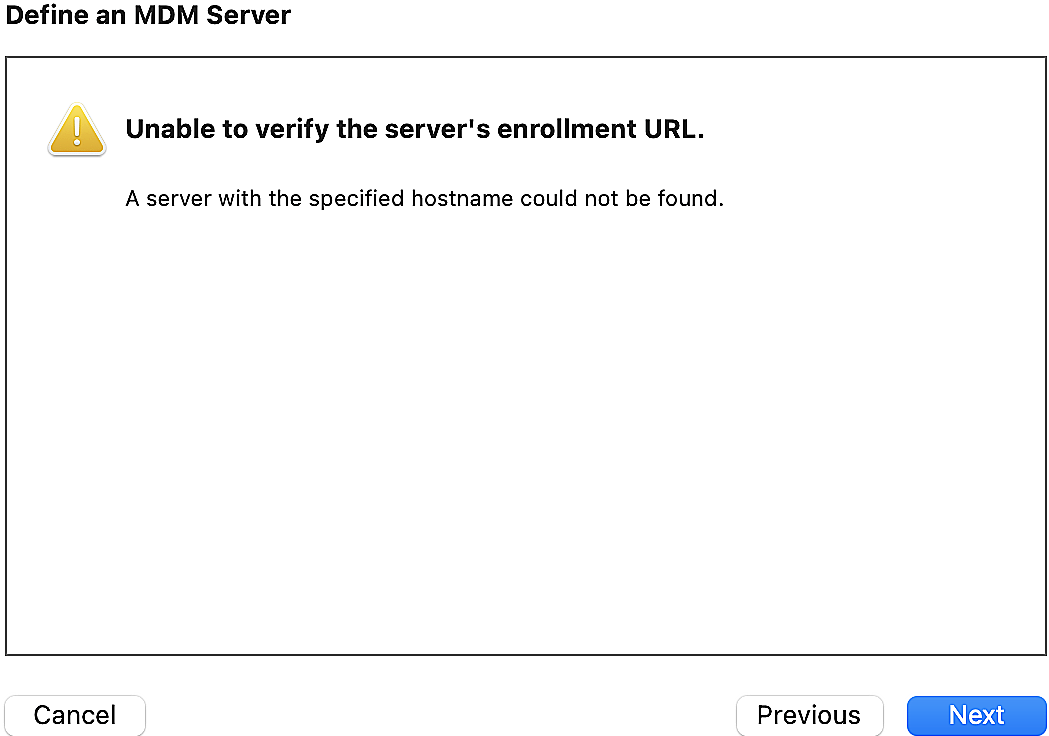 Unable to verify the server's enrollment URL. A server with the specified hostname could not be found.