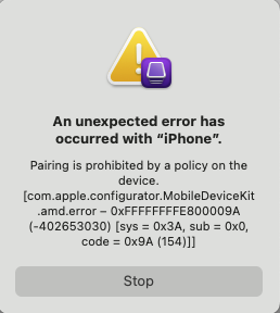 - When Allow iTunes pairing and other USB connections is applied - Remove the restriction from the MDM server and perform enrollment.(or) If you have enrolled via ABM previously, download the supervision identity certificate from MDM server, install it in keychain and use it in Apple configurator enrollment for the organization.