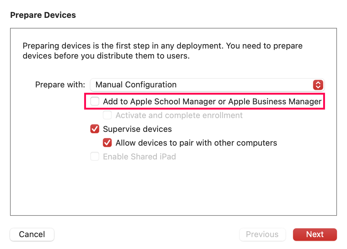 If you have enabled the setting Add devices to Apple Business Manager or Apple School Manager while preparing the blueprint or preparing the device directly.