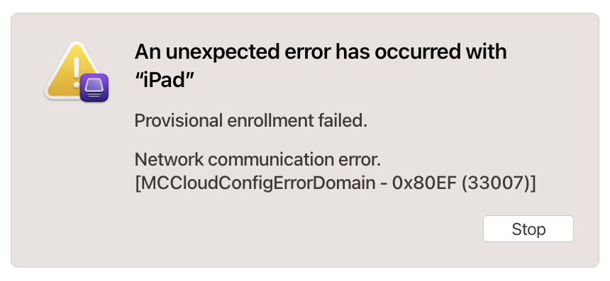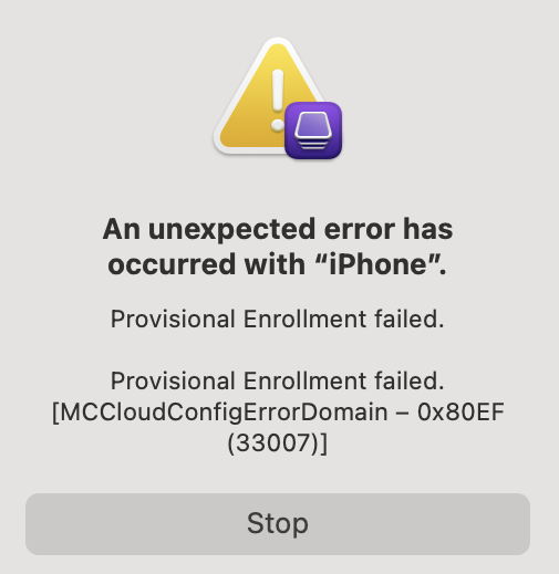 Provisional enrollment failed. [MCCloudConfigErrorDomain - 0x80EF(33007)]