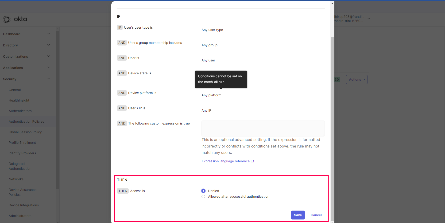 The Catch All Rule is the last set of conditions which Okta will check before allowing or denying access to a device. This rule should be disabled to prevent the possibility of a device getting access thanks to complying with any of the pre-configured conditions under the Catch All Rule.