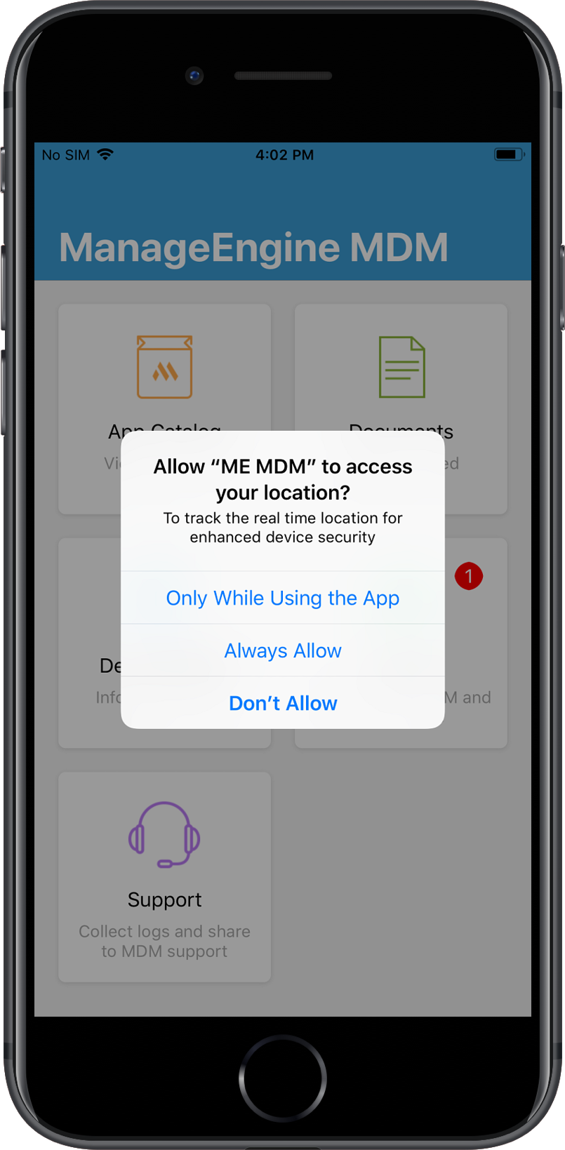 Once ME MDM app is installed, open the app and provide the app with permission for Location Services to enable location tracking.