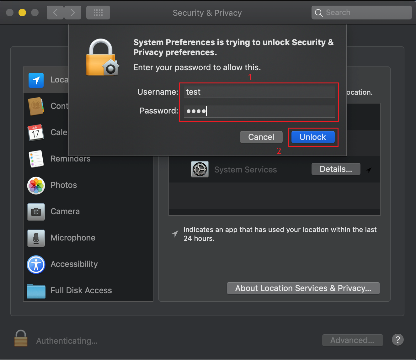 - Click on the Privacy tab. If the padlock on the lower left is locked, click on it to unlock with your admin username and password and choose Unlock.