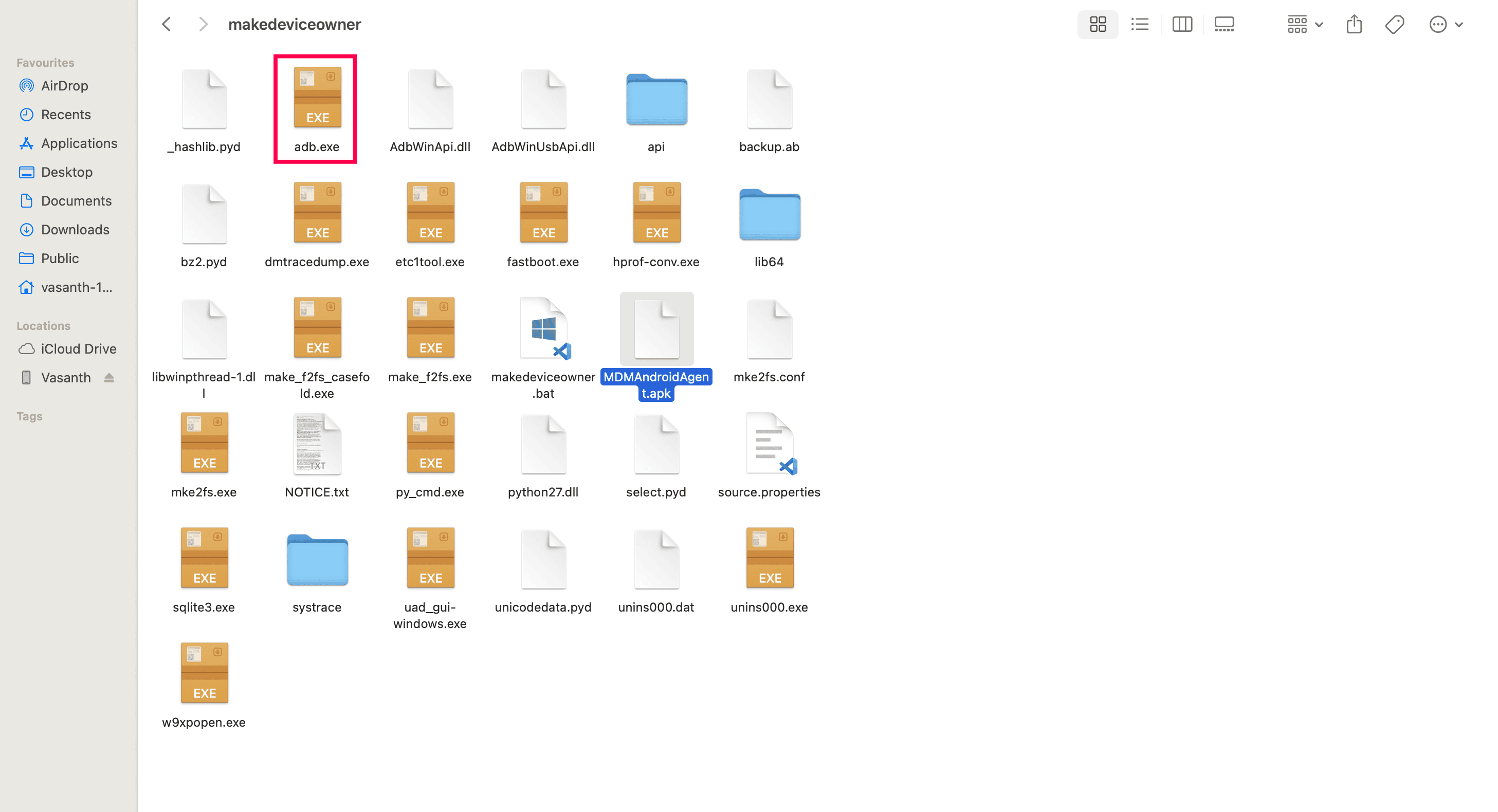 - Place the custom APK (MDMAndroidAgent.apk) file provided by MDM support where the adb.exe file is present (C:\Users\YourUsername\Downloads\makedeviceowner\makedeviceowner\).