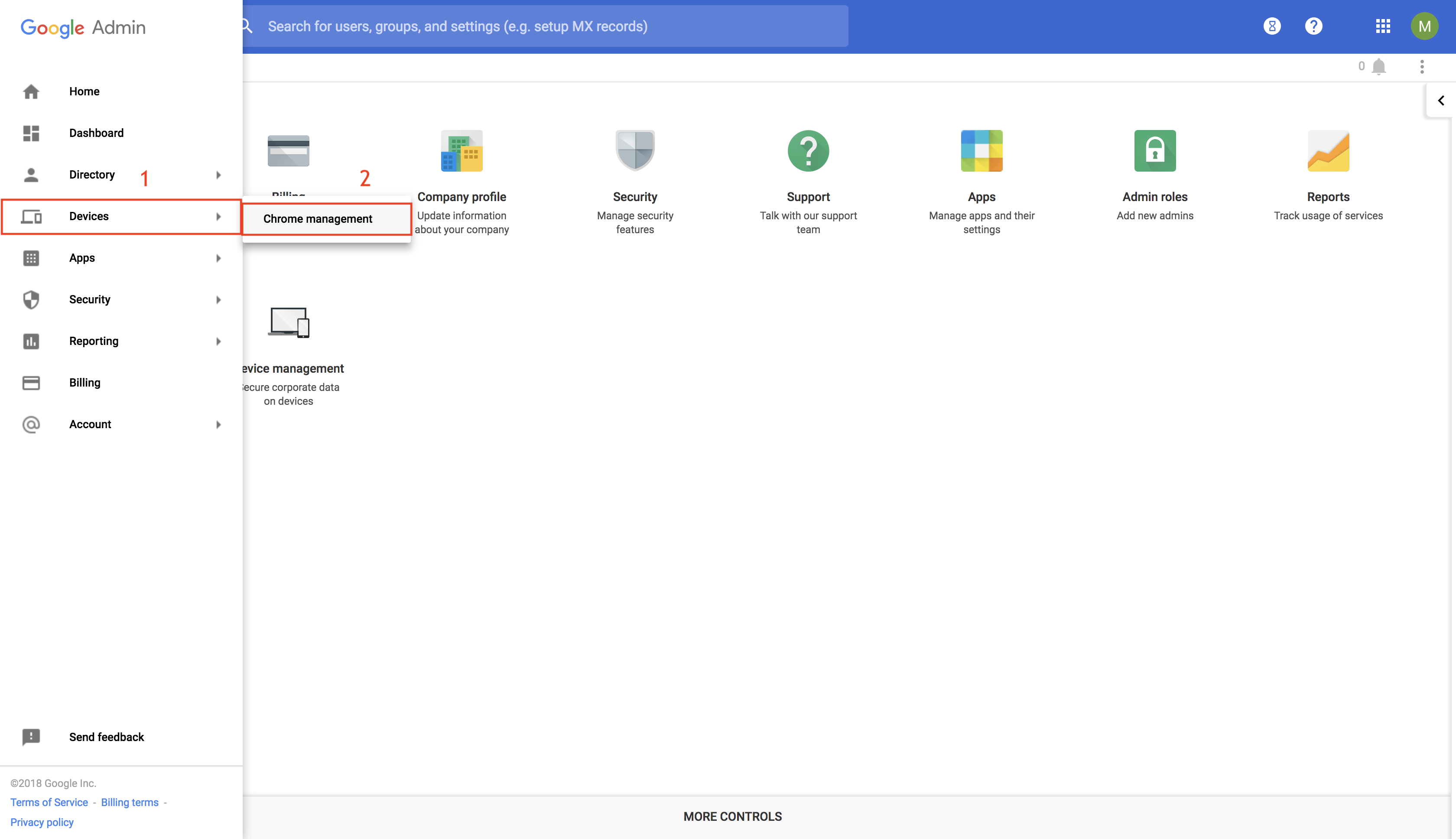 - Click on the Google Admin menu on the left. Click on Device and then select Chrome Management.