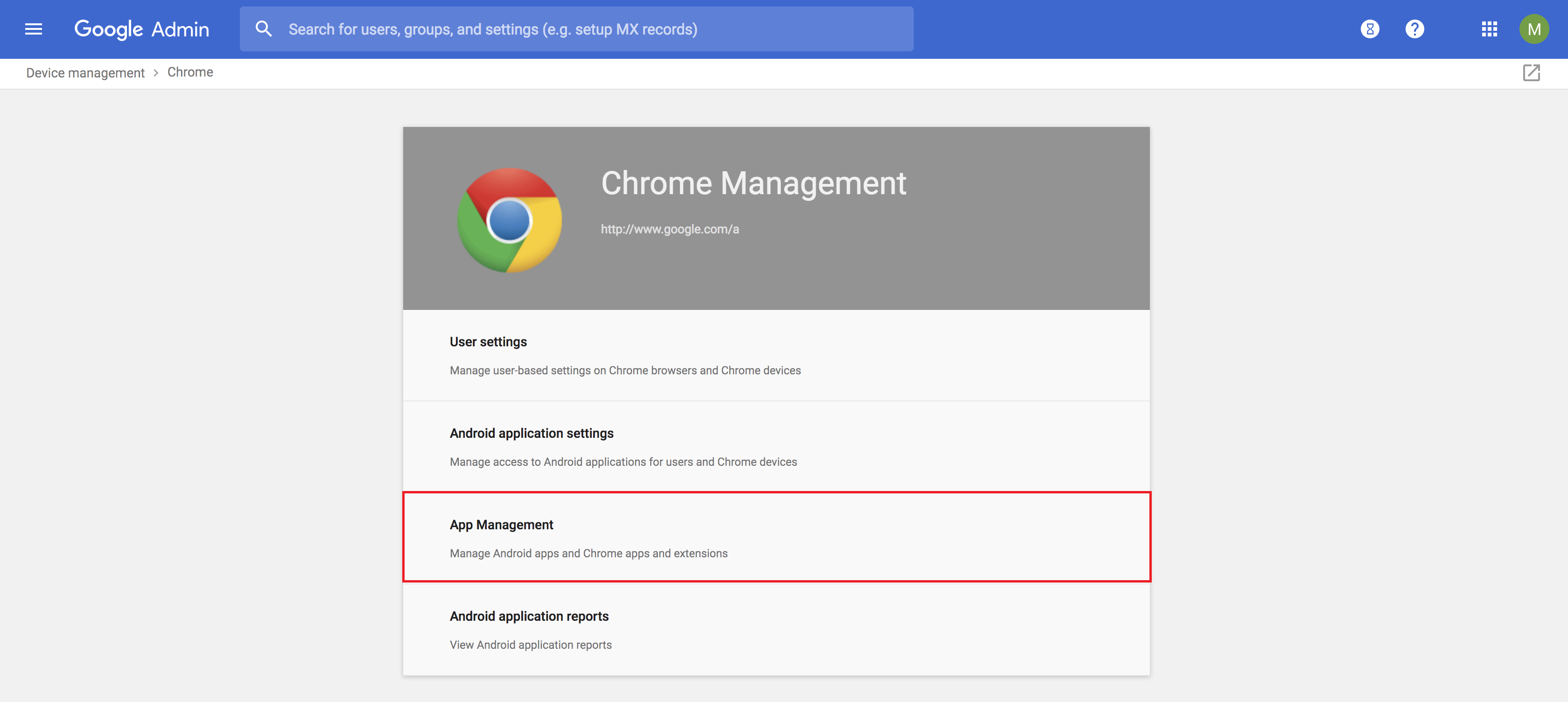 - Now, click on App Management, present under Chrome Management.