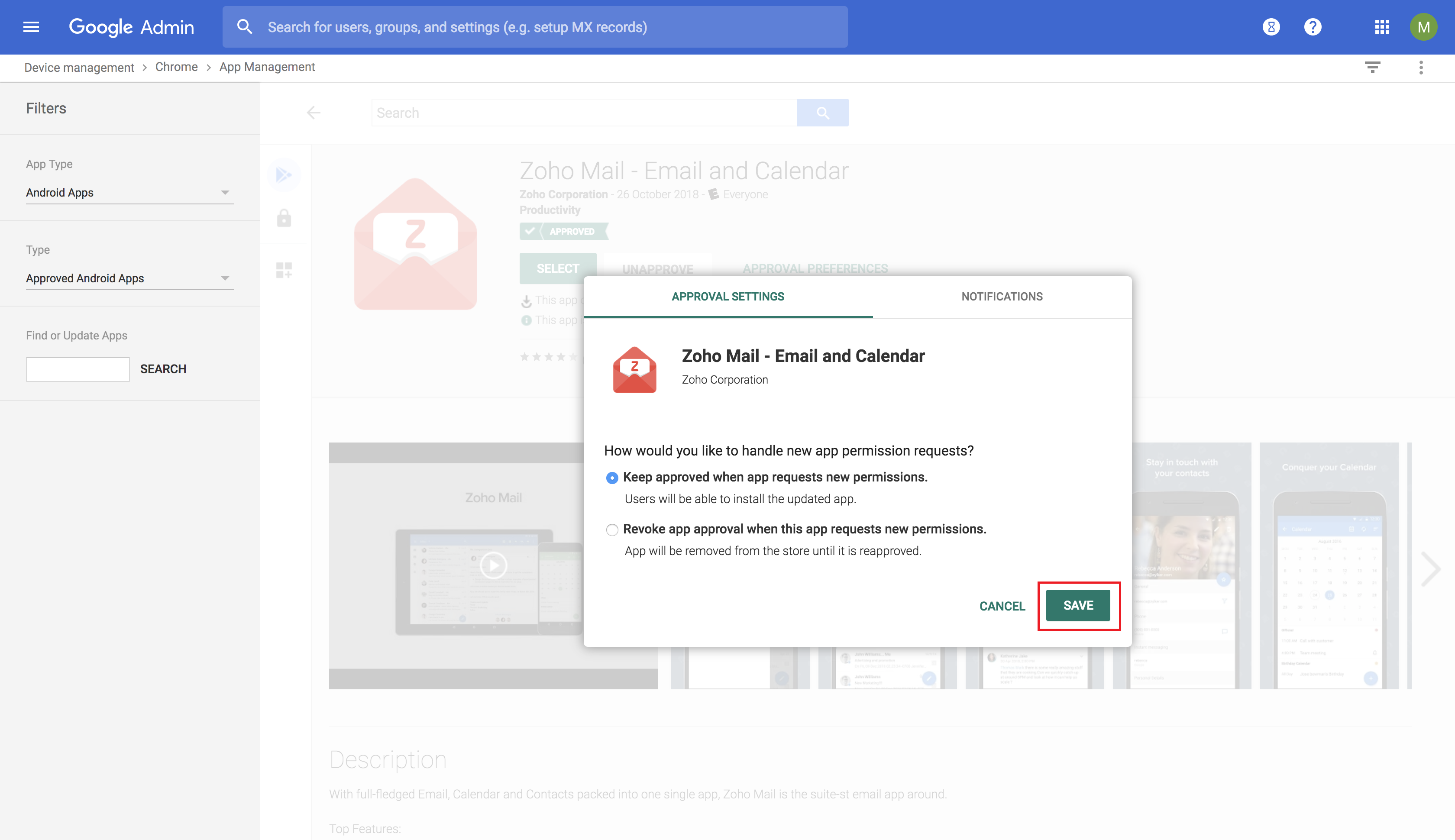 NOTE: In case you've configured Android for Work, you can approve the apps on Play for Work and have the app synced to the App Repository.