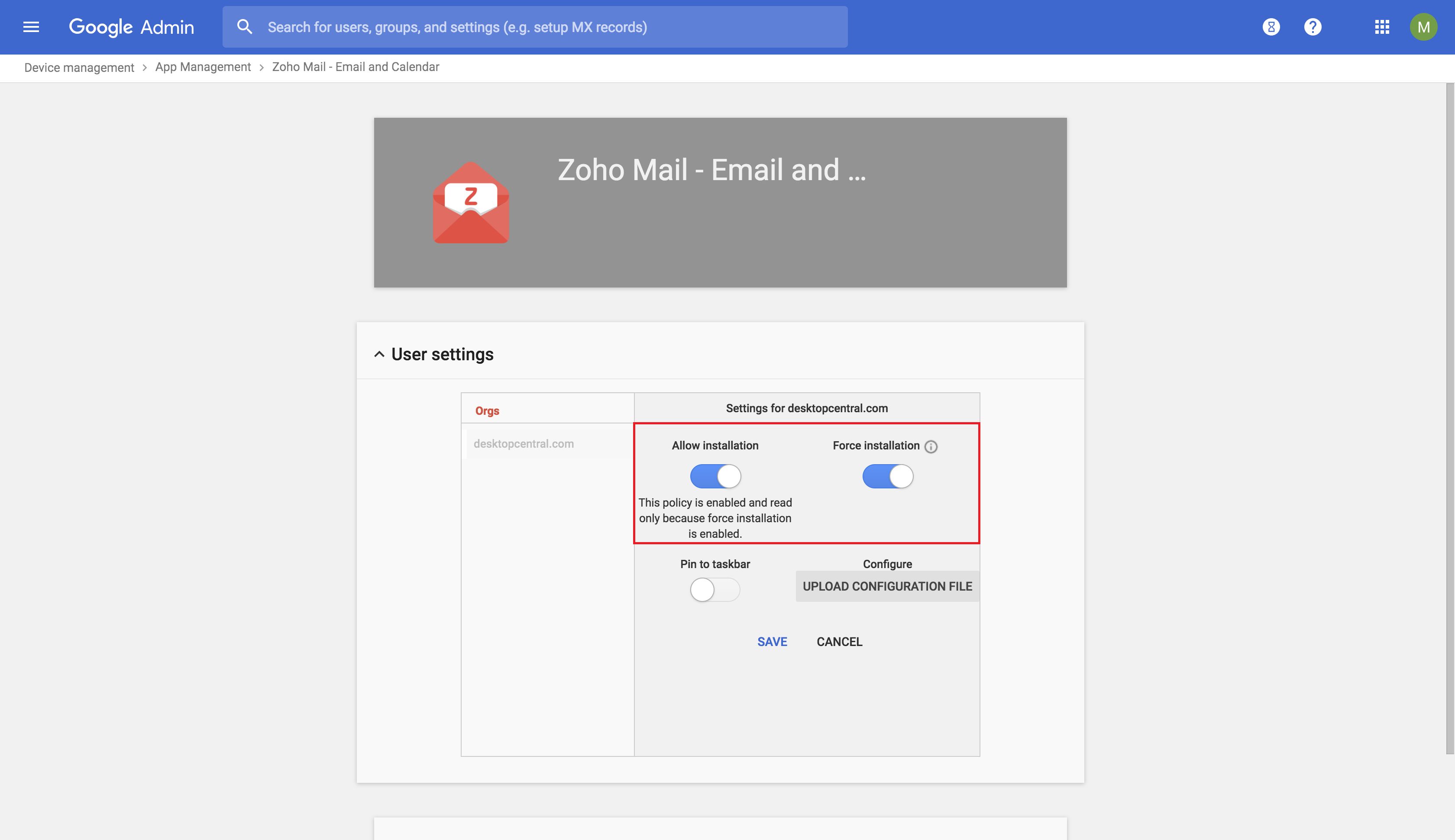 - Toggle to enable Allow Installation and Force Installation. You can also optionally enable the option Pin to Taskbar or also upload a configuration file, to pre-configure the app if need be. If the app approved in the Google Admin portal is present in the App Repository, you can skip the next two steps.