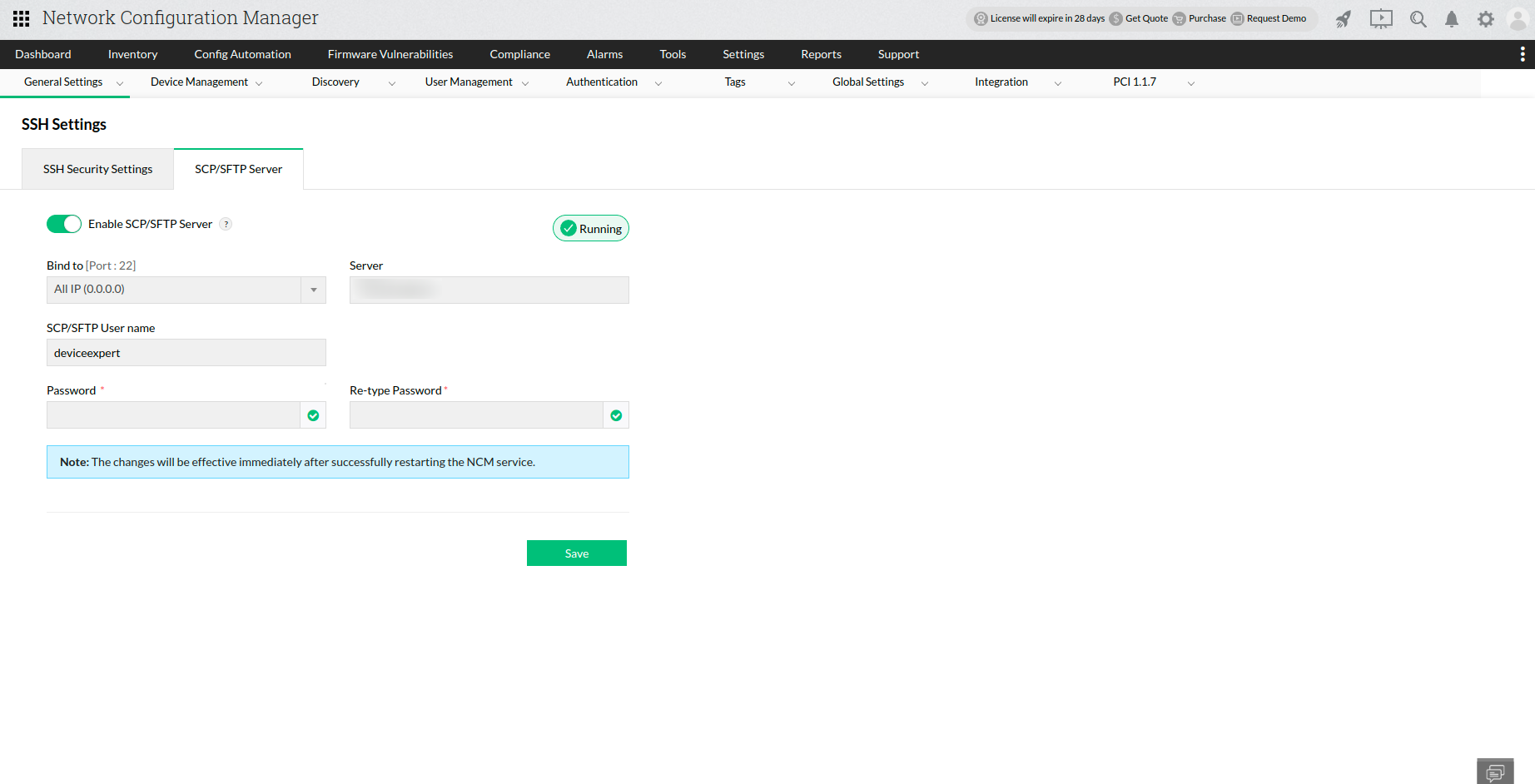 1. Go to Settings -> General Settings -> SSH Settings -> select SCP / SFTP Server tab