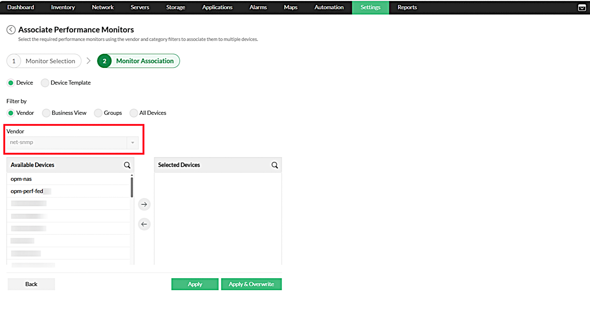 Performance monitors can be associated to multiple devices in bulk from the Settings page. The steps below cover associating the 12 NVIDIA GPU monitors available under the net-snmp vendor to one or more devices. Devices will be associated with the monitors only when the respective CLI credentials are configured for those devices.