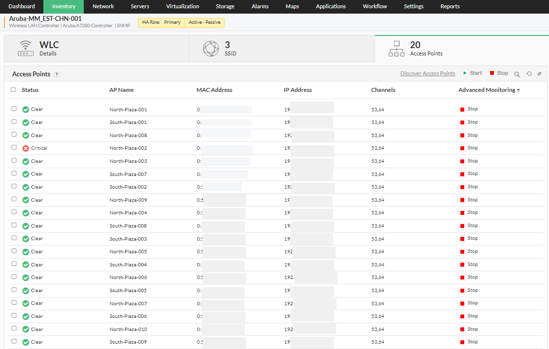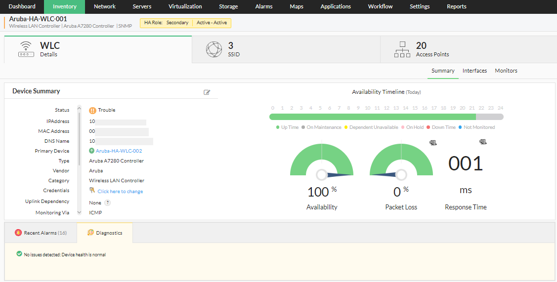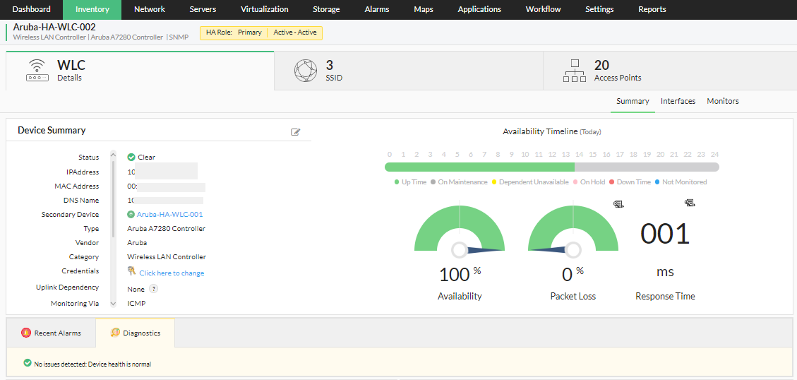 The high availability feature of OpManager helps mitigate failures and reduce downtime faced by the user, by utilizing a secondary standby controller connected to the primary controller via the active-passive HA link over a dedicated redundancy port. In a two node active-passive WLC cluster, the access points are available on only one WLC. If in such case the primary wireless LAN controller goes down, the access points on the controller are instantly moved to the secondary controller instantly, allowing the client devices to continue operations without experiencing any SSID downtime. The security keys of all the client devices connected through the access points, are also transferred to the secondary/standby controller, so the client can re-authenticate automatically.