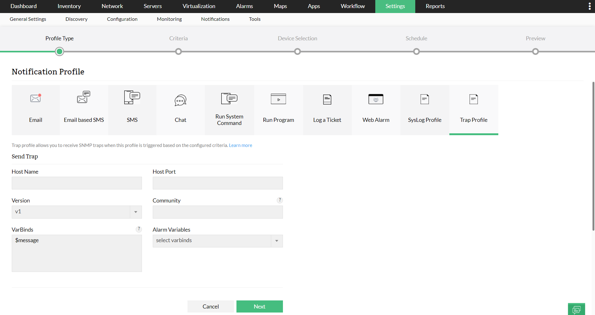 3. Select the Notification type as Trap Profile.
