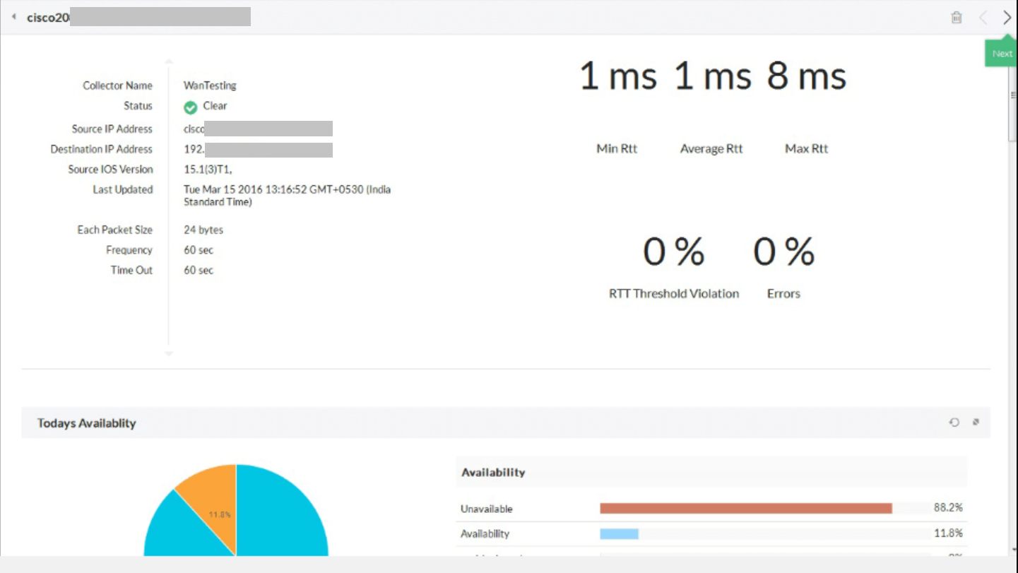 OpManager aids in wireless network monitoring by leveraging Cisco IPSLA to help visualize your WAN links and troubleshoot WAN outages and performance issues. OpManager's WAN RTT (Round-Trip Time) monitor provides details on WAN link latency, bandwidth utilization, Round-Trip-Time, and hop-by-hop performance to resolve poor WAN performance. More..