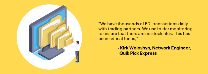 Folder monitoring is crucial for Quik Pick as it is a business-critical parameter. "We have thousands of electronic data interchange (EDI) transactions daily with trading partners. We use folder monitoring to ensure that there are no stuck files. This has been critical for us," said Network Engineer Kirk Woloshyn from Quik Pick Express. Electronic data interchange (EDI) is a standardized form of exchanging business information between two business partners/ companies, electronically.