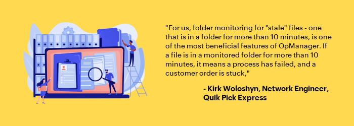 Kirk says that with the help of OpManager, the Quik Pick Express IT team configures thresholds to receive alerts and notifications if certain conditions are not satisfied. "For us, folder monitoring for "stale" files, one that is in a folder for more than 10 minutes, is one of the most beneficial features of OpManager. If a file is in a monitored folder for more than 10 minutes, it means a process has failed, and a customer order is stuck," he said.