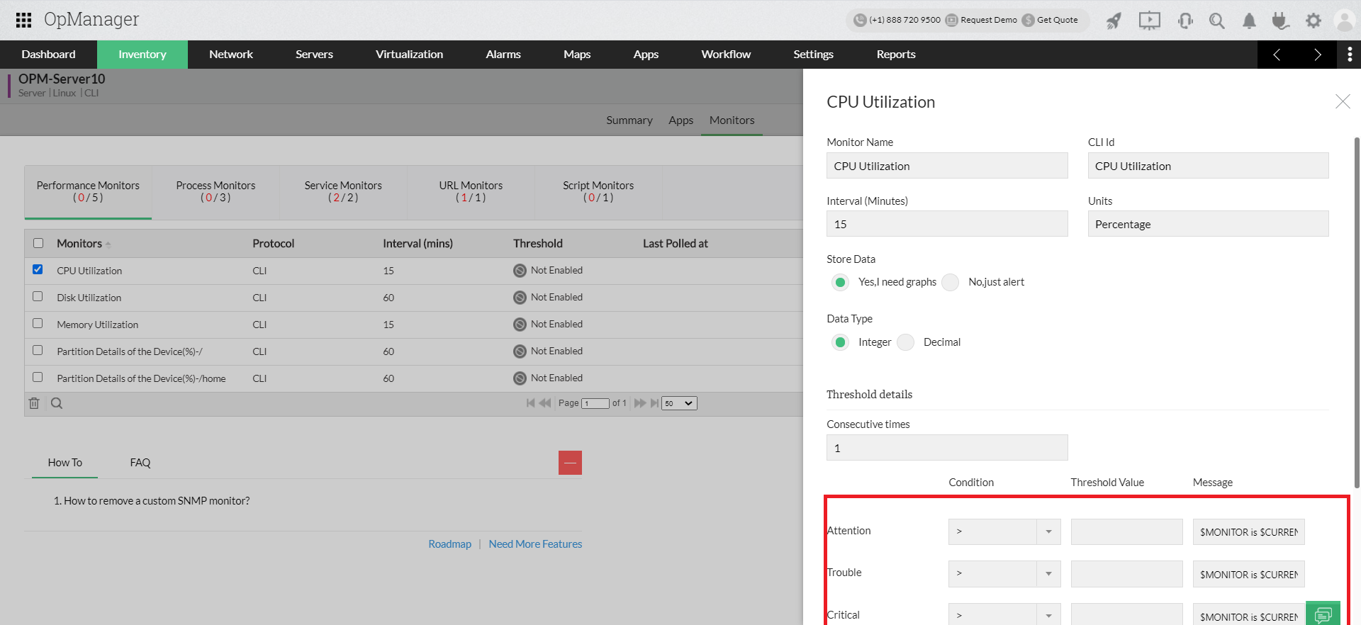 Once this is done, OpManager will be able to discover the Linux server, and it will automatically associate the default monitors as per the device template, ensuring that the performance metrics of the devices are monitored.
