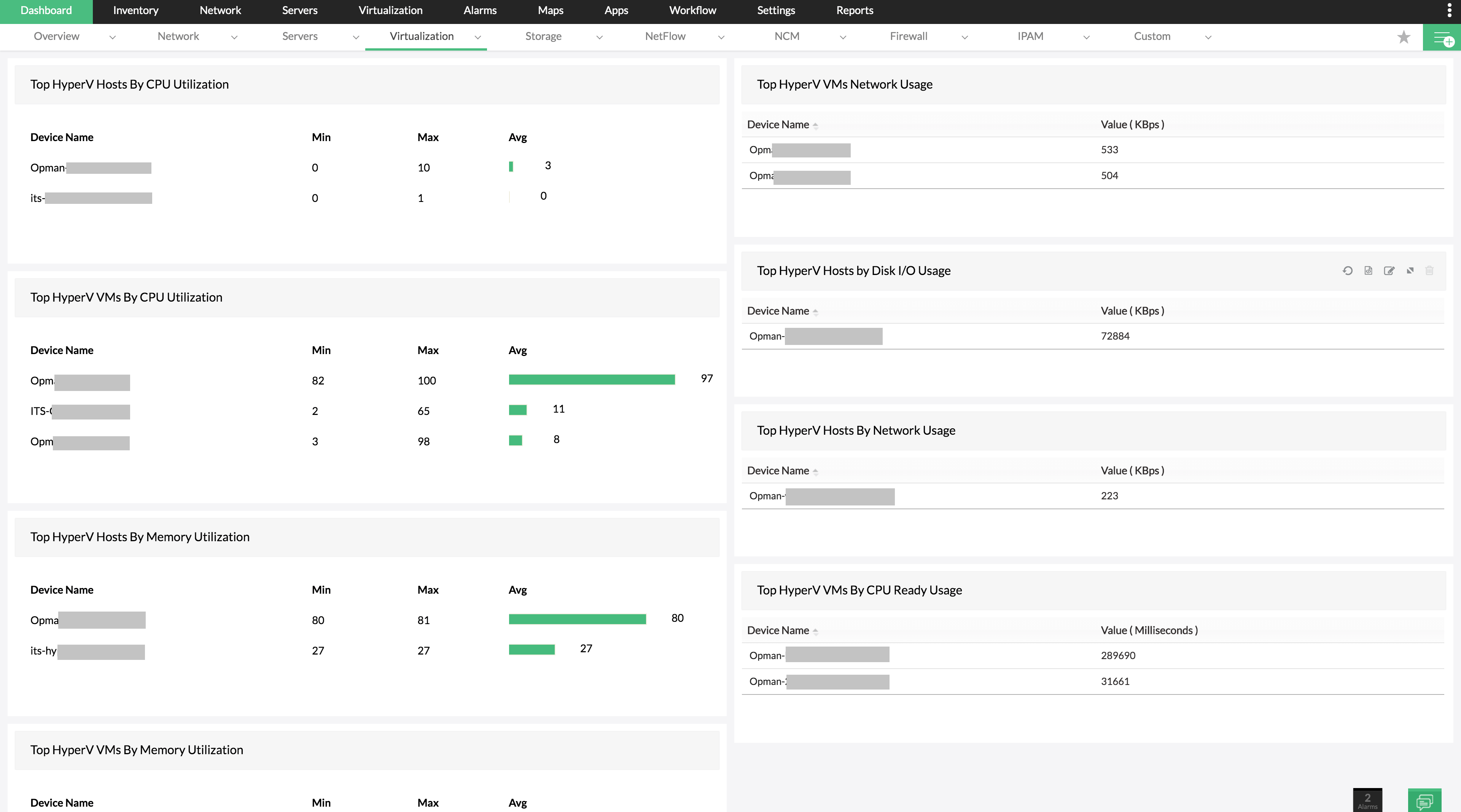 OpManager's virtual network management capabilities enable businesses to manage their virtual environments by monitoring the performance, health, and availability of all their VMs. OpManager is compatible with all major virtualization vendors such as Hyper-V, VMware, Citrix Xen, and Nutanix HCI.