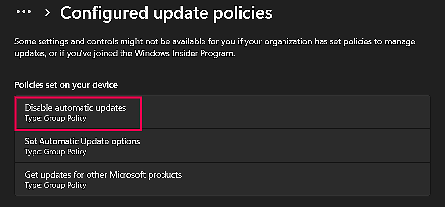 On the endpoint, go to Settings → Windows Update → Advanced options → Configured update policies, and check that the applied policy indicates automatic updates are disabled or controlled as intended.