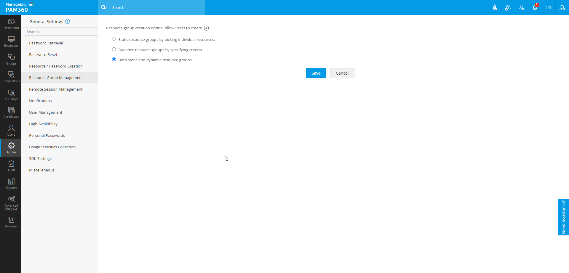 To view and manage all global settings related to resource group management in PAM360, click Resource Group Management from the left pane.