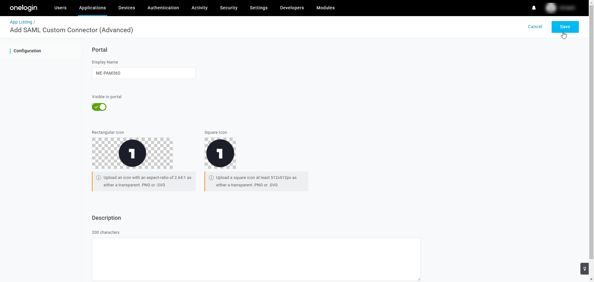 - Display Name - Enter a name of your choice in this field. This name will serve as a unique identifier for PAM360 on the OneLogin portal.