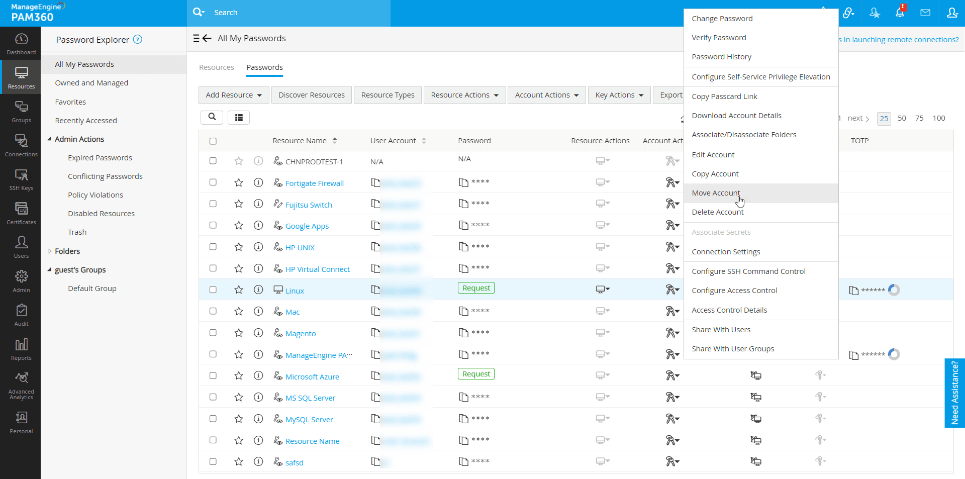 1. Navigate to the Resources tab and switch to the Passwords tab. Select the account(s) to be moved.