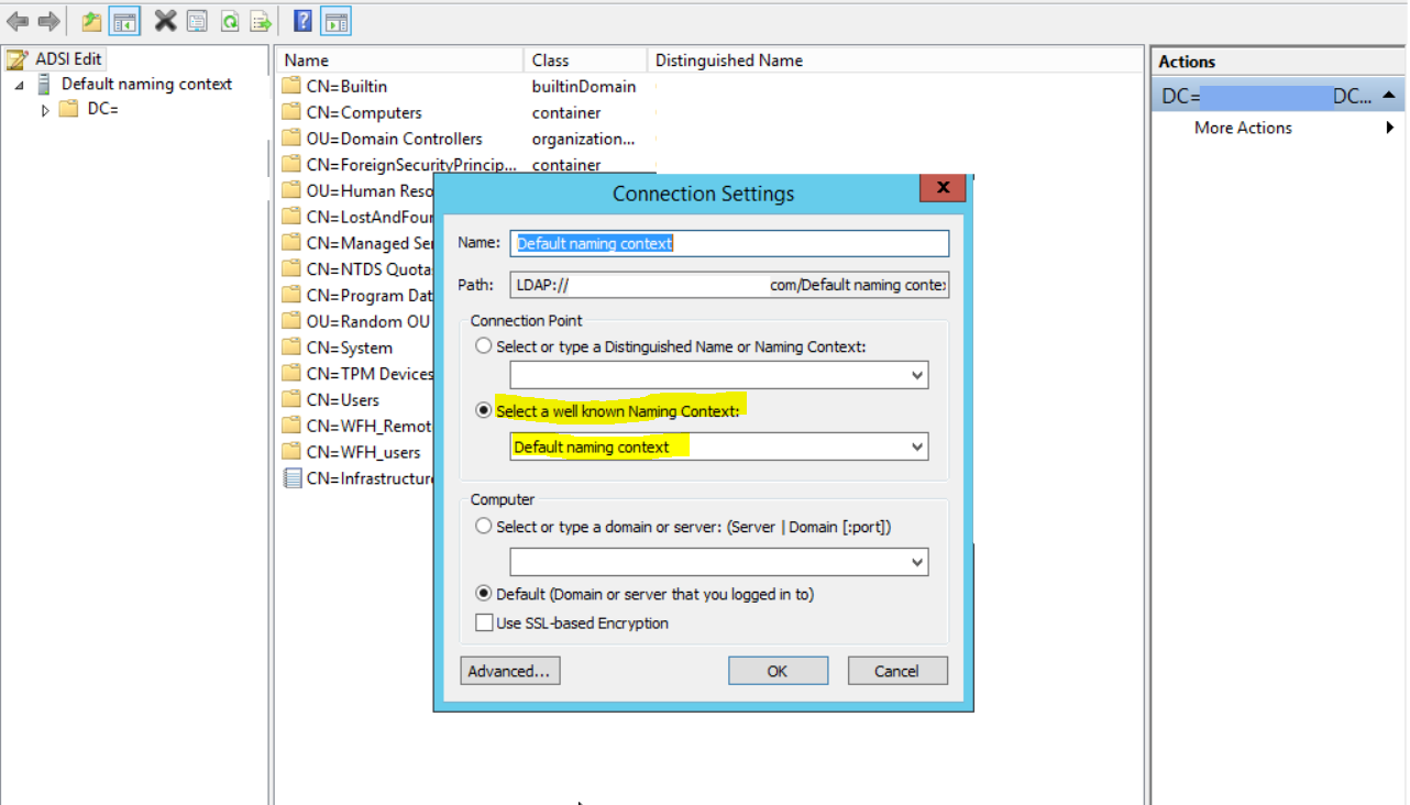 Select the 'Default Naming Context' option from the 'Select a well-known Naming Context' drop down list.
