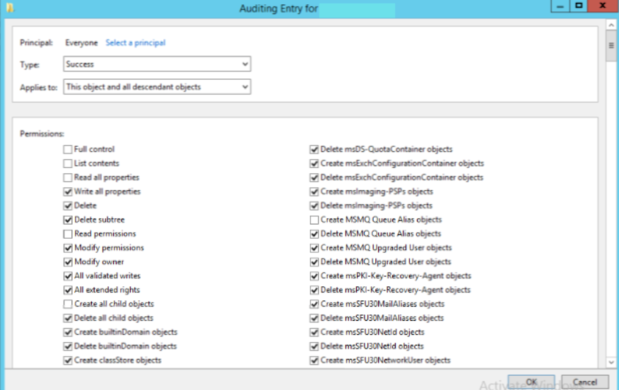 In the'Select' drop-down choose 'This object and all descendant object's. This allows the auditing of the OU's descendant objects. Select'Full Control'in the 'Permissions' section.