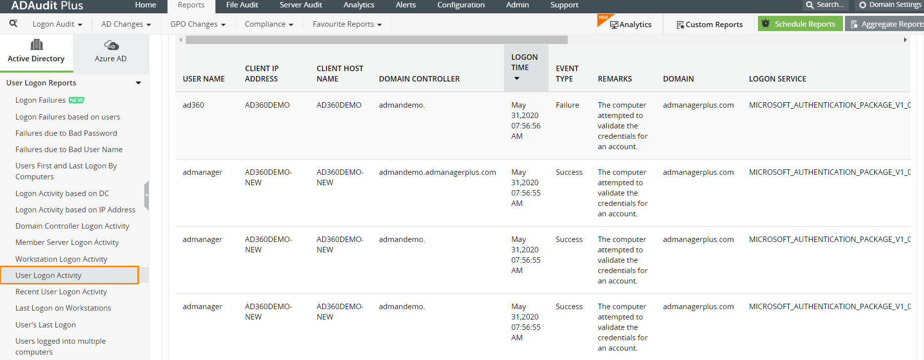 All of this information can be obtained on ADAudit Plus by running specific reports. For example, a report on user logon activity is shown below.