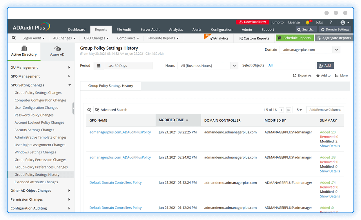View reports detailing the complete history of modifications made to GPO settings along with the old and new values.