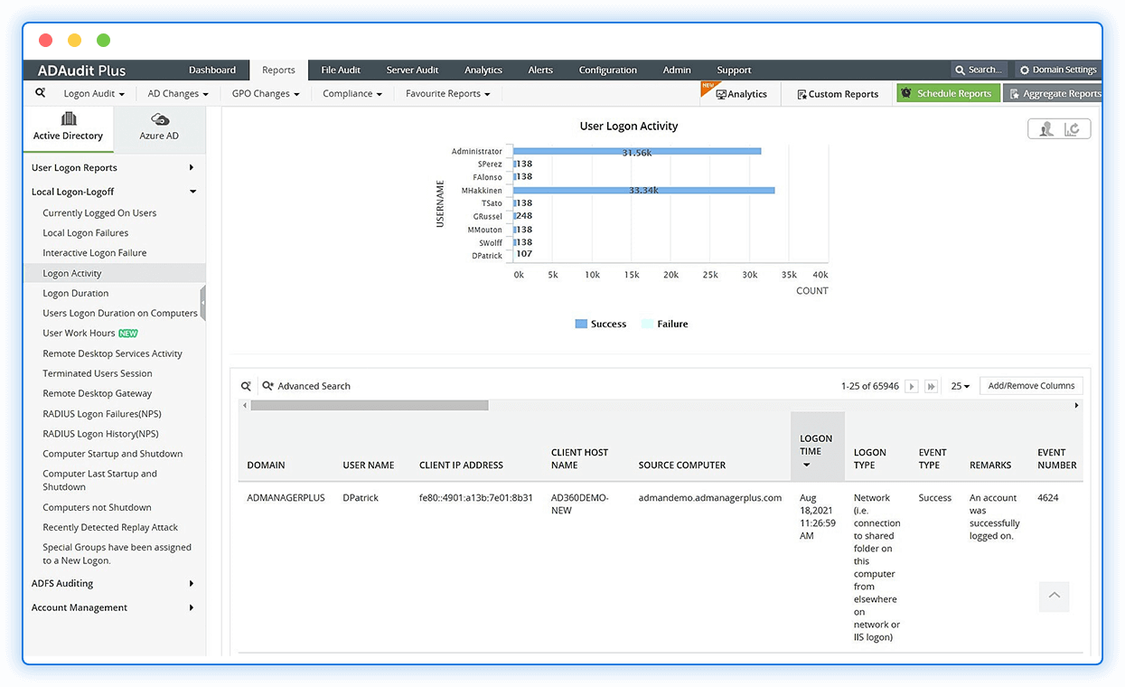 Track users' logon and logoff actions in real time using user logon audit reports.