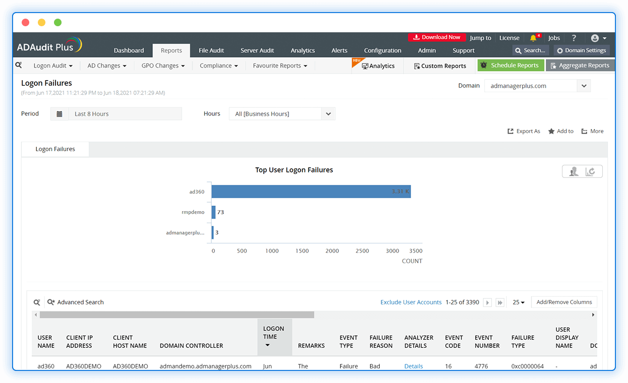 Track successful and failed logon attempts across your AD and investigate the reason for logon failures with consolidated reports.