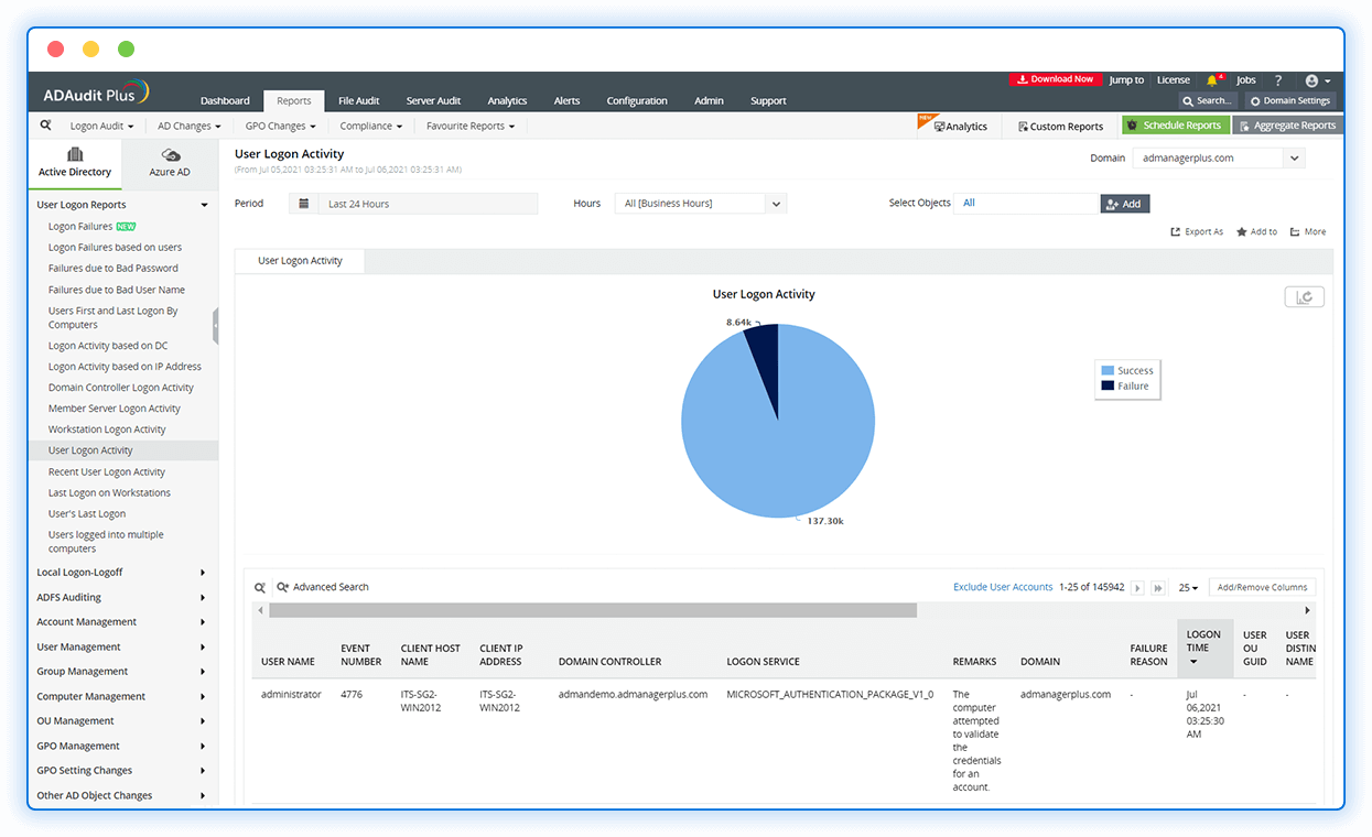 Audit all successful and failed logon attempts, track users logged in to multiple machines, and pull up user login histories with comprehensive reports.