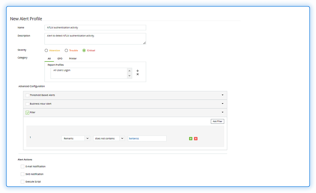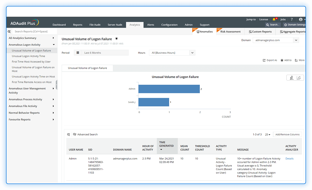Get alerted via email and SMS of critical activities, such as a sudden spike in logon failures.