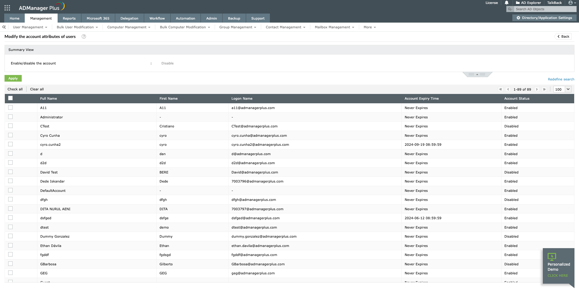 Manage Active Directory user account settings in bulk with ADManager Plus.