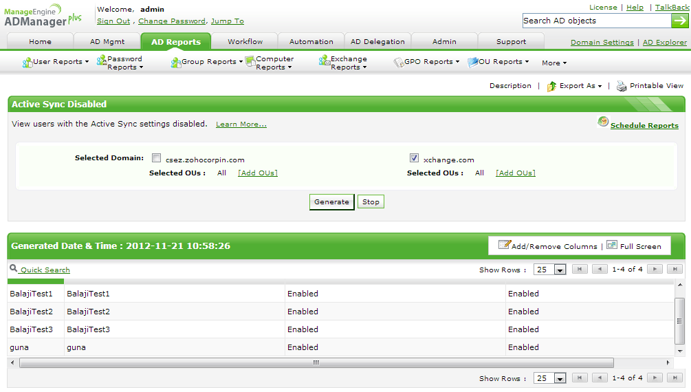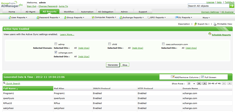 With only the native Microsoft Exchange Server tools, PowerShell, etc. it is quite a tedious task to extract this information. ADManager Plus' Active Sync Enabled / Disabled Reports help Exchange administrators in obtaining this information easily, for multiple domains, from just a single console. In fact, ADManager Plus offers over 150+ pre-built Active Directory Reports and Microsoft Exchange Server Reports that enabled administrators to fetch all the required information about their AD and Exchange environments, instantly and pain-free, with only mouse clicks.