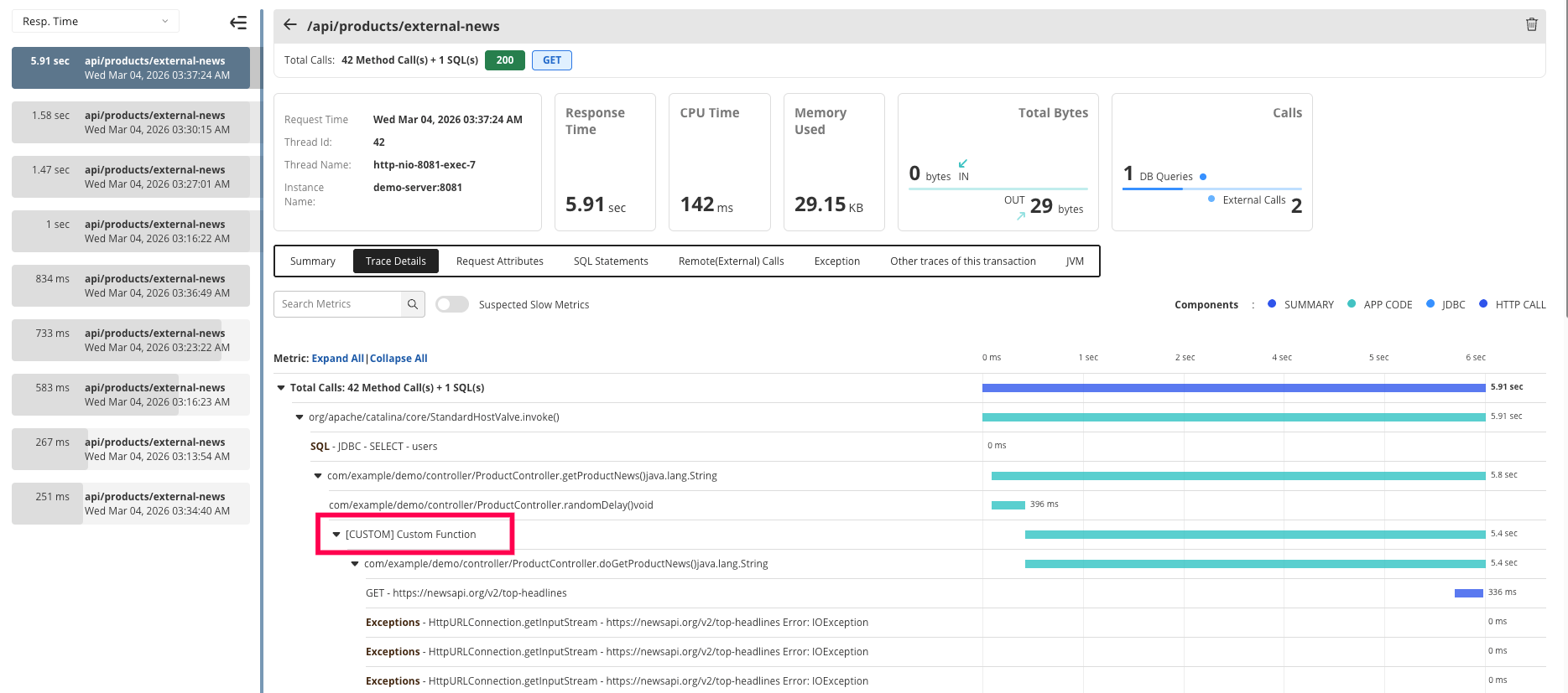 In general, APM Insight Java Agent monitors commonly used frameworks and libraries. With Java Agent API, you can track custom metrics to monitor parameters that are specific to your application and thus obtain finest methods for Java monitoring. This helps in contextual debugging. The Java Agent API allows you to annotate methods that are to be monitored. Additionally, you can provide a custom name for your methods and components to make it easier to identify and troubleshoot them.