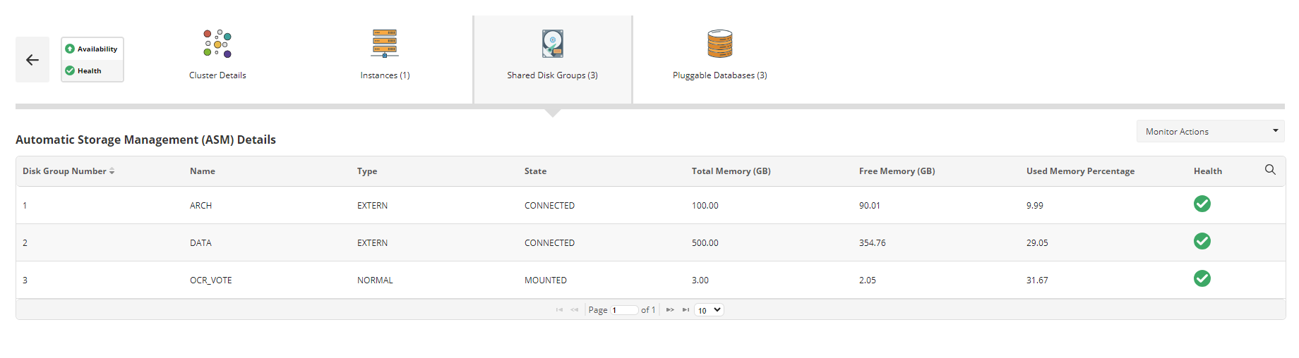 Monitor Disk Group types and states to identify any disk group that might be in a degraded state due to disk failures. Initiate repair actions promptly to prevent disruptions to the database service. Isolate disk groups that are heavily utilized and redistribute data across disks to balance the load and improve performance. You can even anticipate data growth based on 'Used Memory' percentage and execute the necessary expansions or archiving strategies.