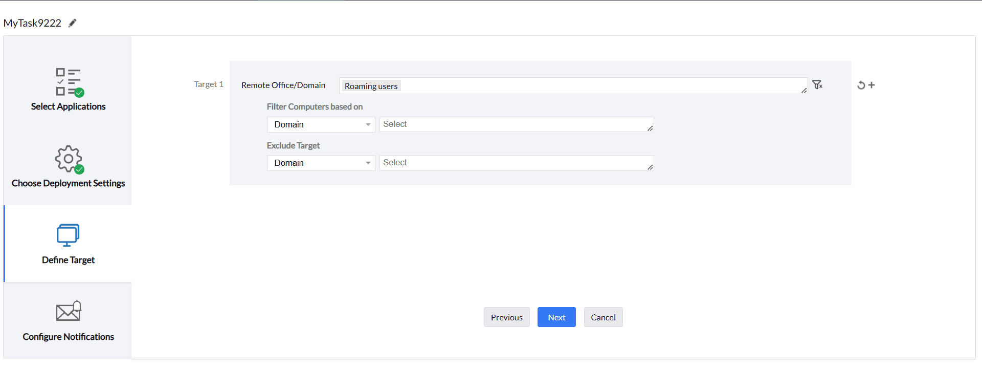 After choosing the deployment settings, you can choose to include or exclude target computers of your choice under the Define Target section, as shown in the above image. To learn more about Defining Targets, refer to this page.