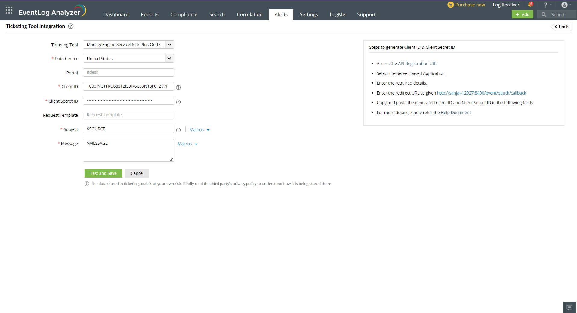 9. Provide the Subject and Message for the alert—these can be selected from a predefined list under Macros or entered manually as per your requirements. Click the Test and Save button to proceed. Upon clicking, a verification popup will appear—click the URL provided to approve the integration with ServiceDesk Plus On-Demand clients.