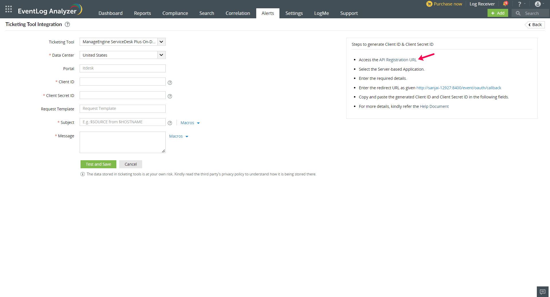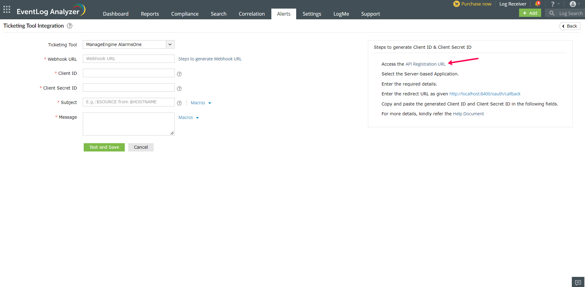 4. Click API Registration URL in EventLog Analyzer, to generate a Client ID and Client Secret ID.