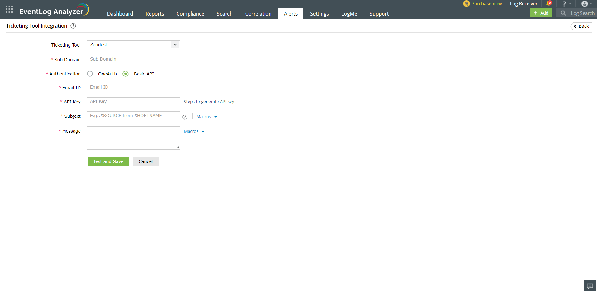 Configuration in EventLog Analyzer for Zendesk integration: