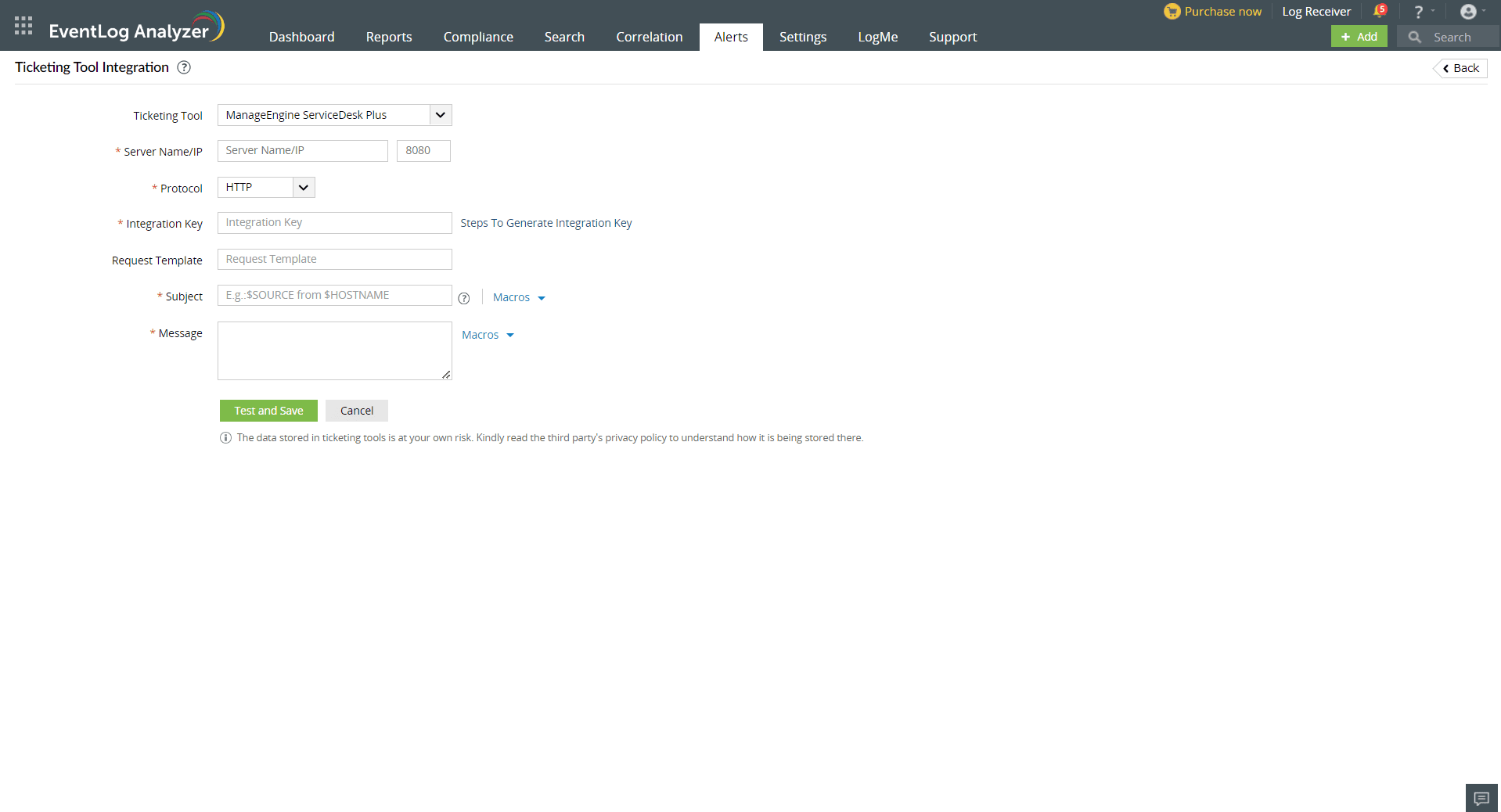 In EventLog Analyzer, navigate to the Alerts tab and click Ticketing Tool Integration under Alert Configuration. From the Ticketing Tool drop-down list, select ManageEngine ServiceDesk Plus.