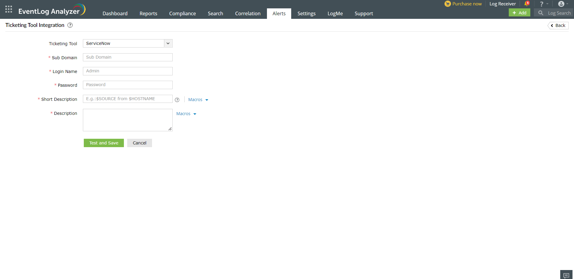 In EventLog Analyzer, navigate to the Alerts tab and click Ticketing Tool Integration under Alert Configuration. From the Ticketing Tool drop-down list, select ServiceNow.