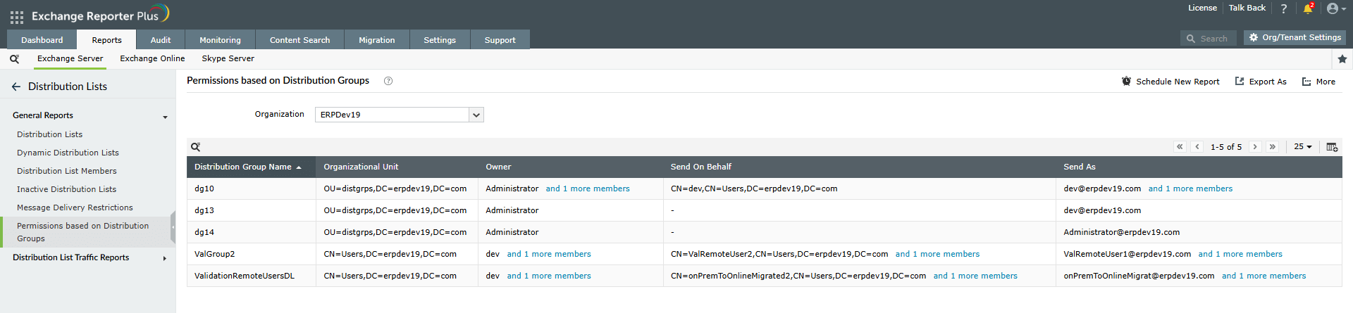 The Distribution List reports display data for Microsoft Exchange server versions 2003, 2007, 2010, 2013, and 2016. Export the reports to a desired destination folder or even email them in various formats, including CSV, PDF (Adobe Acrobat), XLS (Excel) and HTML.